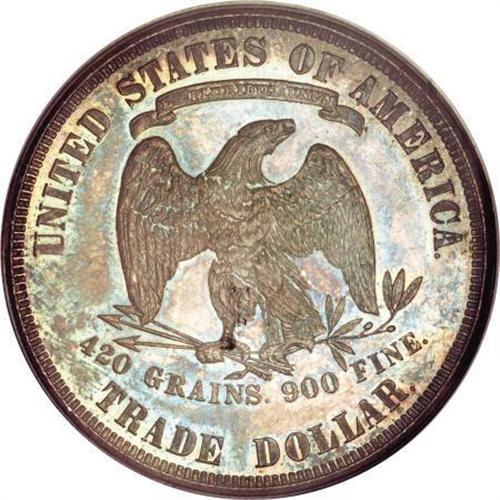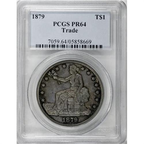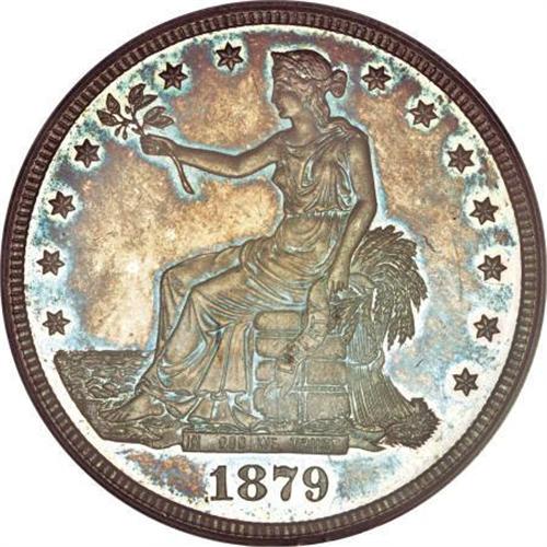 <B>1879 T$1 PR64 PCGS.</B></I> The second year of proof-only Trade dollar issues, the 1879 saw a more generous mintage (than the 1878) of 1,541 coins. This example boasts lovely original lilac centers with steel-blue patination near the rims on each side. The toning is fairly light, allowing the passage of considerable luster from underneath. A charming example of an issue that will be much more elusive in Gem proof condition.<BR><BR><B>Coin Engraver:</B> William Barber<BR><BR><b>Shipping:</b> Coins & Currency (<a target="_blank" href="http://www.heritageauctions.com/common/shipping.php">view shipping information</a>)
