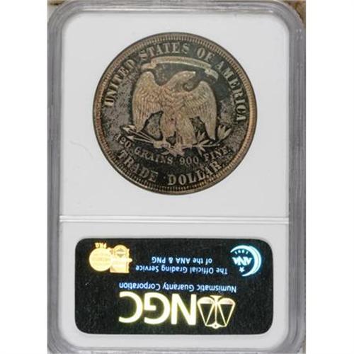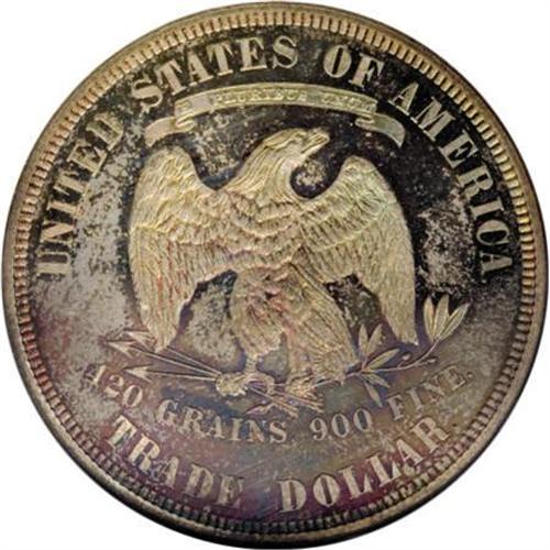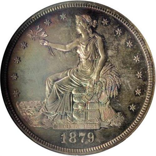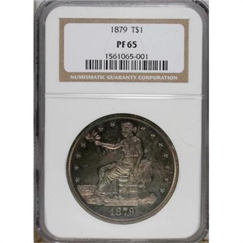 <B>1879 T$1 PR65 NGC.</B></I> The 1879 Trade dollar had a proof-only mintage of 1,541 pieces. David Bowers (1993) writes: "Most specimens were saved, but with varying degrees of care. Examples are readily available, for a price ... ." Faint magenta and cobalt-blue patina runs over the obverse, while the same color pattern takes on slightly deeper hues on the reverse. The design elements are well impressed throughout. A couple of minor planchet flaws are visible at about 3 o'clock at the obverse border. Census: 40 in 65, 47 finer (6/07).<BR><BR><b>Shipping:</b> Coins & Currency (<a target="_blank" href="http://www.heritageauctions.com/common/shipping.php">view shipping information</a>)