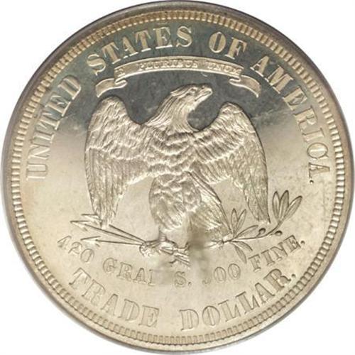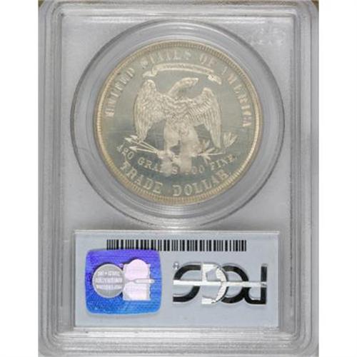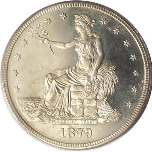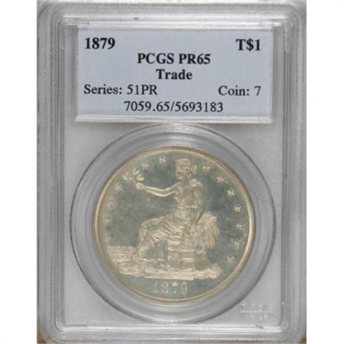 <B>1879 T$1 PR65 PCGS.</B></I> Beginning with 1879, only Philadelphia produced Trade dollars and exclusively in proof format. This gold-toned specimen offers deeply reflective fields with light haze at the margins. The devices are boldly impressed, and the eagle displays a degree of frost, which contributes to the reverse's distinct cameo effect. Population: 35 in 65, 29 finer (4/07).<BR><BR><b>Shipping:</b> Coins & Currency (<a target="_blank" href="http://www.heritageauctions.com/common/shipping.php">view shipping information</a>)