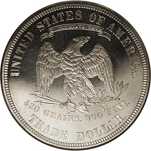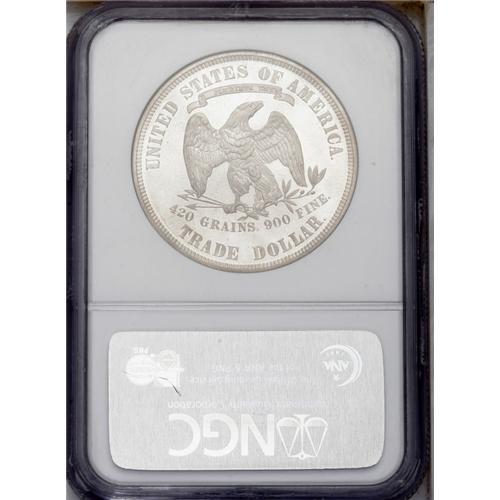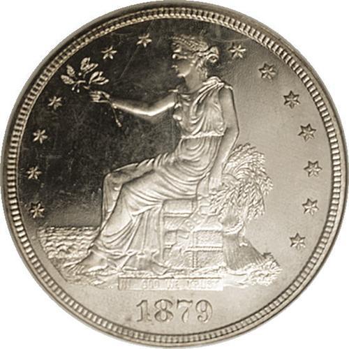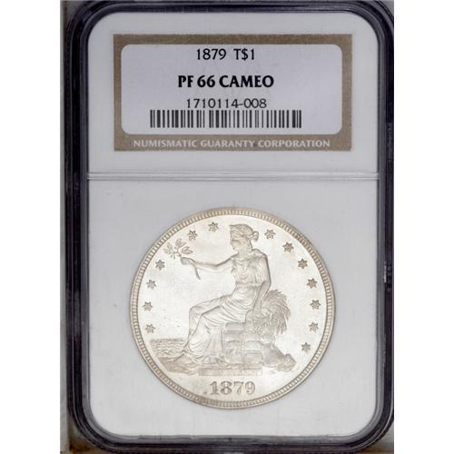 <B>1879<T$1> PR66 Cameo NGC.</B></I> No business strikes were produced in 1879, the first of the proof-only years that continued through the end of the Trade dollar series in 1885. This is a flashy proof striking that was obviously well produced. The fields are glittering and mirror-like, even through the light overlay of pinkish-gray patina that is seen on each side. The devices show a significant presence of mint frost, and the combination of deep mirrors with frosted devices gives the coin its cameo appearance. A well-preserved proof striking of this low mintage year.