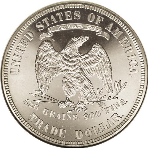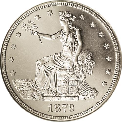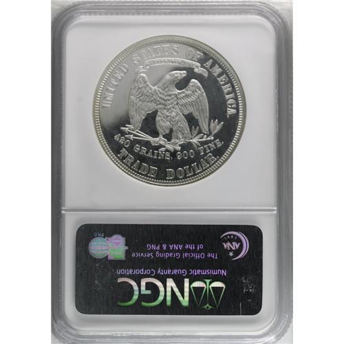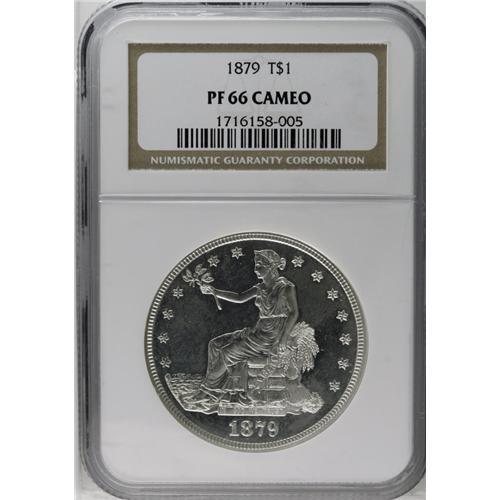 <B>1879<T$1> PR66 Cameo NGC.</B></I> Tremendous quality in a proof Trade dollar. The fields show illimitable depth of reflectivity and the devices are well frosted, which produces a strong white-on-black contrast on each side. The striking details are beyond reproach, even for a proof, and the surfaces are impeccably preserved. From the first of the proof-only years at the end of the Trade dollar series, only 1,541 pieces were struck. This Premium Gem belongs in a collection of the highest quality.<BR><I>From The Mulholland Collection.</B></I>