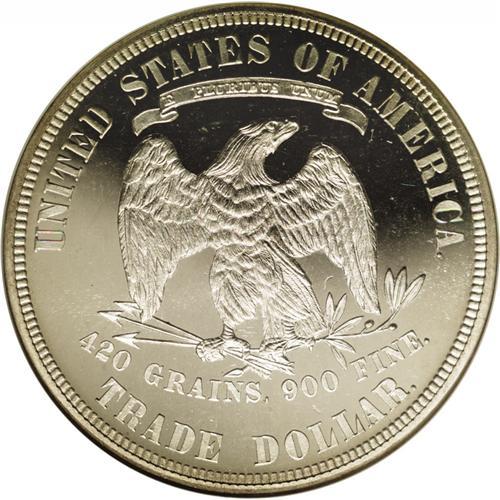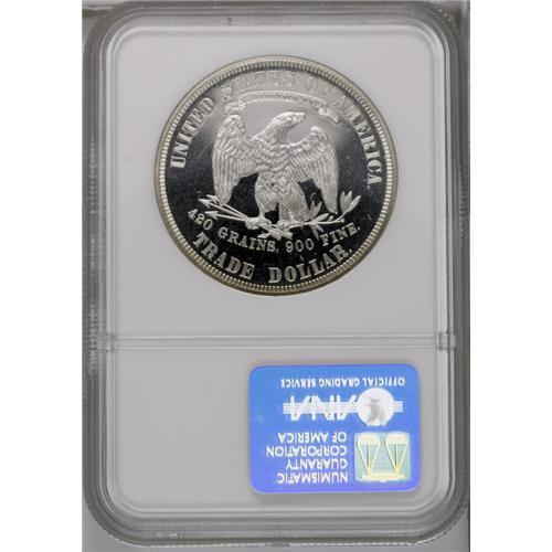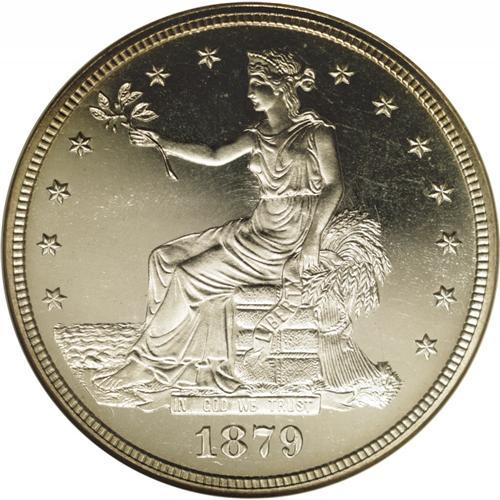 <B>1879<T$1> PR66 NGC.</B></I> David Bowers (1993) says of the proof-only 1879 Trade dollar that: "Most specimens were saved, but with varying degrees of care. Examples are readily available, for a price, in the different grade levels from Proof-60 to Proof-65." His assertions are substantiated by the population figures - well over a thousand examples ( the mintage was 1,541 pieces) have been certified, the majority falling below the Gem grade level. Better preserved specimens, such as the PR66 offered here, are considerably more challenging. This coin is essentially untoned with impeccably preserved surfaces that exhibit exquisitely struck design elements. A cameo-like effect is yielded by the mildly frosted motifs that appear to float over glassy, watery fields. Census: 38 in 66, 9 finer (3/06). <BR><BR><B>Important notice:</B> Heritage usually auctions material at the rate of 200-250 lots per hour. On some occasions eBay Live bid software or the Internet may not be able to keep up with the pace of the auction. We recommend placing a realistic absentee bid now as insurance to avoid disappointment. Occasionally the auctioneer may eliminate or reject an eBay Live bid, and the auctioneer may also reopen a lot after the close of the eBay live bidding (usually because we missed an audience bid), and may reject your bid even if it shows you as the winning bidder. By bidding via eBay Live, you agree that Heritage may award the lot to another bidder at its sole discretion under the circumstances described above or any other reasonable circumstances. Since eBay bids are not shown to us until we open the lot on the floor, we treat those bids just like floor bids. In most cases the floor responds before the eBay bid is presented to us, due to Internet lag time, so for consistency we have made it a policy that floor bids are always considered first over tie eBay live bids. Also please note that all Heritage lots purchased through eBay Live carry a 20% Buyer's Premium. Please make sure you read the Terms and Conditions before you bid. This lot is being auctioned in conjunction with a live floor auction by Heritage Galleries & Auctioneers. All final auction and invoice information will be supplied by Heritage Galleries & Auctioneers, and all other information should be considered preliminary. Lot:2236 <BR><BR><B>Winning Notification and Billing:</B> After the FINAL session in this auction is complete, Heritage will send e-mail and snail mail invoices. This process normally takes several days. All final auction and invoice information will be supplied by Heritage Galleries & Auctioneers, and all other information should be considered preliminary. <BR><BR>This auction will be conducted on a live auction floor and over the Internet through eBay Live. If you choose to place an absentee bid, please take a moment to <font color='#0000ff'><u><a href='http://pages.ebay.com/liveauctions/help/before/laabsentee.html'>learn how eBay Live absentee bidding works</a></u></font><font color='#000000'>