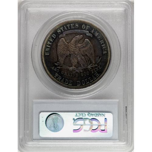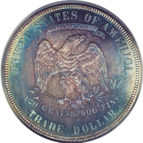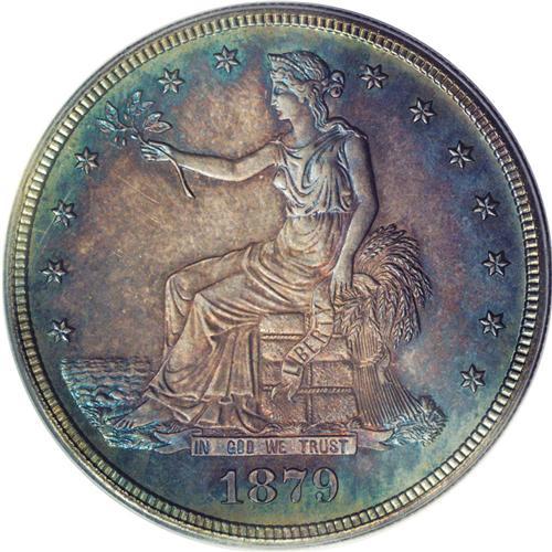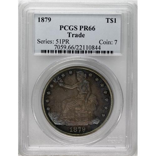 <B>1879 T$1 PR66 PCGS.</B></I> By 1879 the fate of the Trade dollar as a denomination had been sealed, but production of proofs for the benefit of collectors trudged on for another seven years, culminating with one of the great rarities in American numismatics, the 1885. The initial demand for these specimens appears to have been relatively strong, as evidenced by the highest recorded proof mintages for the type in 1879 and 1880. Broad distribution of these special strikings helps explain their difficulty in Gem and better condition, as many were cleaned, mishandled, or even spent before the Trade dollar was demonetized in 1887. Perhaps less than 10 percent of the 1,541 pieces issued received the meticulous care of this richly toned Premium Gem. Deep layers of violet, golden-rose, and cobalt-blue toning are intertwined over impeccable mirrored surfaces. Population: 22 in 66, 7 finer (11/06).<BR><BR><b>Shipping:</b> Coin/Currency (<a target="_blank" href="http://www.heritageauctions.com/common/shipping.php">view shipping information</a>)