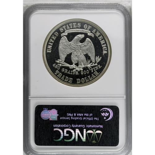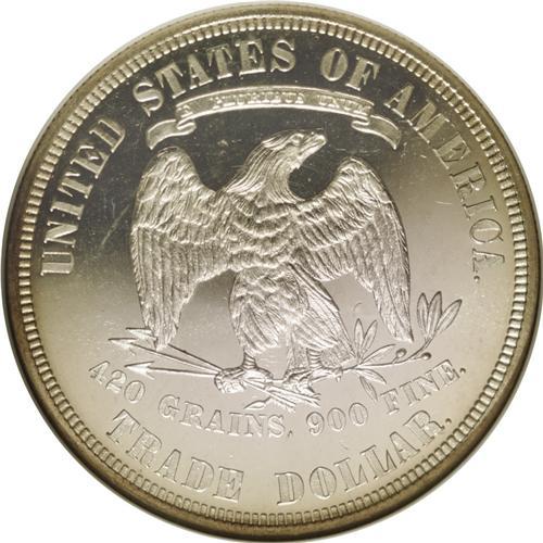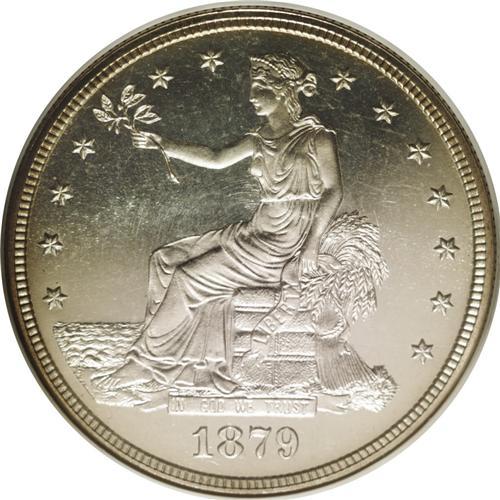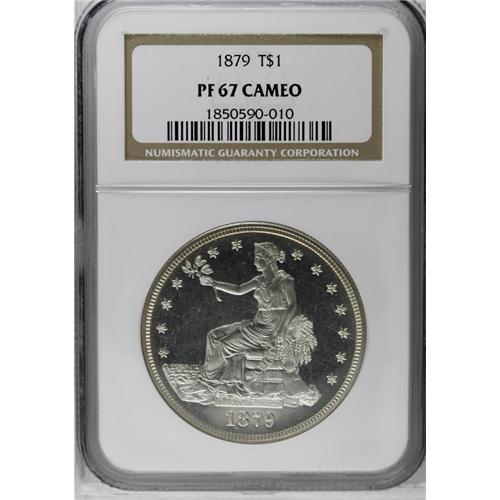 <B>1879<T$1> PR67 Cameo NGC.</B></I> It has been two years since we last offered a PR67 representative of the 1879 Trade dollar, and that coin did not possess the awe-inspiring cameo contrast that is evident on both sides of the present specimen. Both the devices and the fields are devoid of distracting blemishes, and there is no mentionable toning, save for a bare hint of golden color near the borders on each side. Every feature rises sharply above the glassy fields with full striking definition and bountiful mint frost. While we typically have the good fortunate of offering several 1879 Trade dollars each year, the appearance of a Superb Gem in one of our auctions is truly a special occasion for bidders. For future pedigree purposes, a couple of tiny lintmarks were struck into the reverse field; one above the first L of DOLLAR, the other above the olive leaf between the right wing and leg. A coin that will form the centerpiece of any advanced collection. Census: 14 in 67 Cameo, 1 finer (5/06).