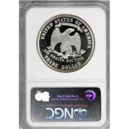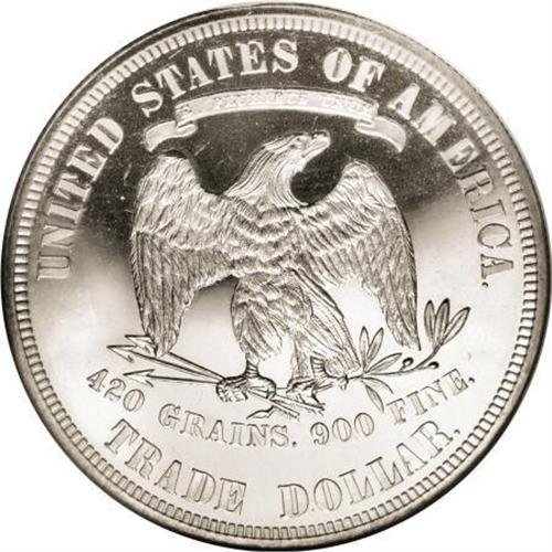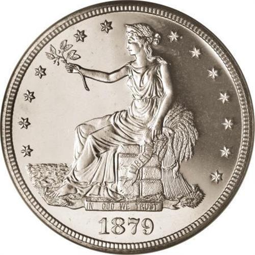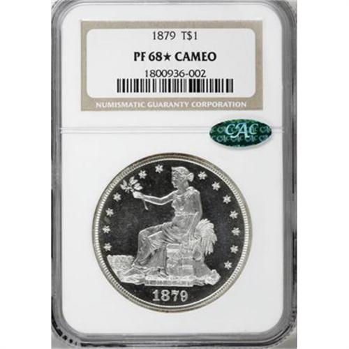 <B>1879 T$1 PR68 </B></I><img src="/images/star.gif" width="10" height="10" alt="" border="0"><B> Cameo NGC. CAC.</B></I> Secretary of the Treasury John Sherman halted the production of business strike Trade dollars on February 22, 1878, and thereafter the type was issued only in proof format. The coin was unneeded, as beginning in 1878 the nation's mints were engrossed in manufacturing prodigious amounts of similarly unneeded Morgan dollars.<BR> For those reasons the 1879 Trade dollar thus begins the run of proof-only issues, culminating in the fabulous 1884 and 1885 Trade dollars. The mintage of the 1879 is pegged at 1,541 pieces, a fairly large mintage for a proof issue of the era. The large production is explained in Bowers' <I>Silver Dollars and Trade Dollars of the United States: </B></I>"There arose in 1879, and continued into 1880, a popular numismatic speculation (later extended to the general public). Word spread that certain coins were of low mintage and would become rare. The 'best' condition was considered to be Proofs (business strikes were not available in the trade dollar series). Emphasis was on nickel three-cent pieces and trade dollars, both denominations of which were minted in record Proof numbers. A heightened interest developed in other Mint products as well, especially patterns. Several years later this speculation would extend to regular issue Proof and business strike gold dollars."<BR> The short-lived fervor for proof pieces of the two years likely accounts for the existence of numerous high-grade examples. The present survivor of the 1879 issue could justifiably keep company with those legendary 1884 and 1885 Trade dollars, although at a much lower price! NGC has certified six 1879s PR68 Star Cameo, the finest-graded at that service within any contrast designation. (A single Trade dollar, an 1878, is graded PR69 Star Cameo, the only piece finer.)<BR> At first glance the coin appears worthy of an Ultra Cameo designation, as the mirrors are both blinding and deep, with the desirable black-on-silver contrast collectors covet. The surfaces are expectedly free of even the most trivial impairments. A single dotlike planchet depression, as made, in the left reverse field below the T of UNITED will serve as a pedigree marker. A fine and essentially unimprovable piece.<BR><BR><b>Shipping:</b> Coins & Currency (<a target="_blank" href="http://www.heritageauctions.com/common/shipping.php">view shipping information</a>)