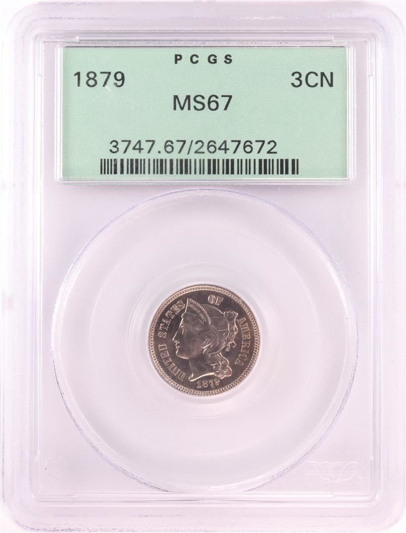 One 1879 Three Cent Nickel Coin PCGS MS67 Old Green Holder. PCGS Graded.