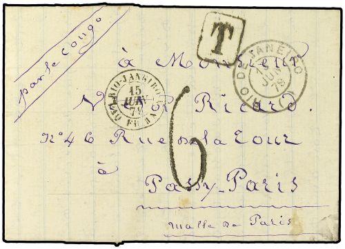 1879 Un-stamped envelope to FRANCE cancelled by RIO DE JANEIRO datestamp, with boxed TAX hand-stamp sent on the steamer "Congo" with French paquebot RIO DE JANEIRO PAQ. FR No 4 datestamp, charged "6" in black on arrival in France with FRENCH entry cachet and receiver on reverse. Nice item.