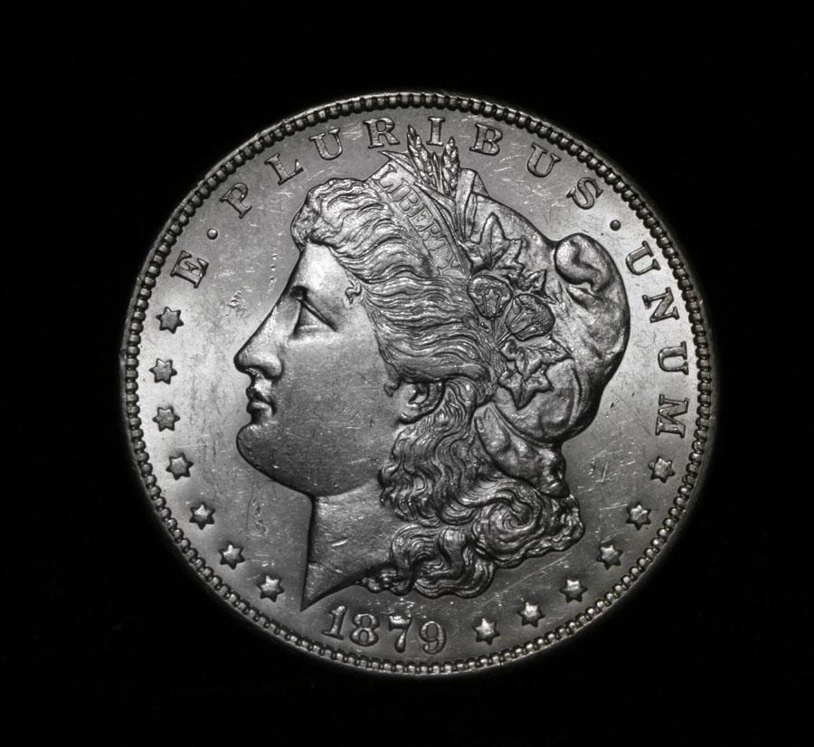 A very nice example of a very tough variety. Blast White, great Luster. This is the VAM 52, Interest Level 4 Rarity 5, which translates to very desirable, and quite rare. Due to slow transportation of the period, the new reverse dies did not make it to San Francisco in 1879 on time. The production run briefly began with the reverse dies from 1878 but this was a short run as the dies arrived shortly after production began and the majority of the year were struck with the new dies. Of the 9 million 1879-s minted only 1.5% were with the reverse of 78. Coin World's Coin Values lists ms64 at $2000 and The Wholesale Greysheet Value is $925. Estimated Value $1200