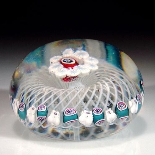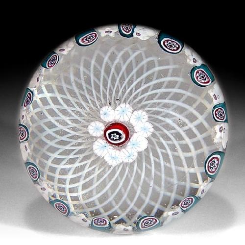 Antique New England Glass Company patterned millefiori paperweight, with a central red, black, and white cane, encircled by a ring of white and pale blue canes, on a double-swirl white latticinio cushion, which is bordered by a ring of alternating green and white canes. Diameter 2 1/2". NO RESERVE