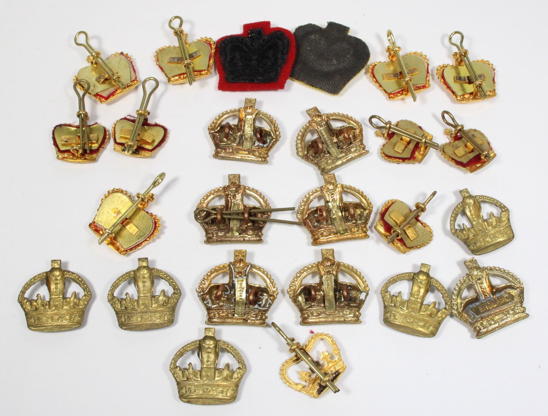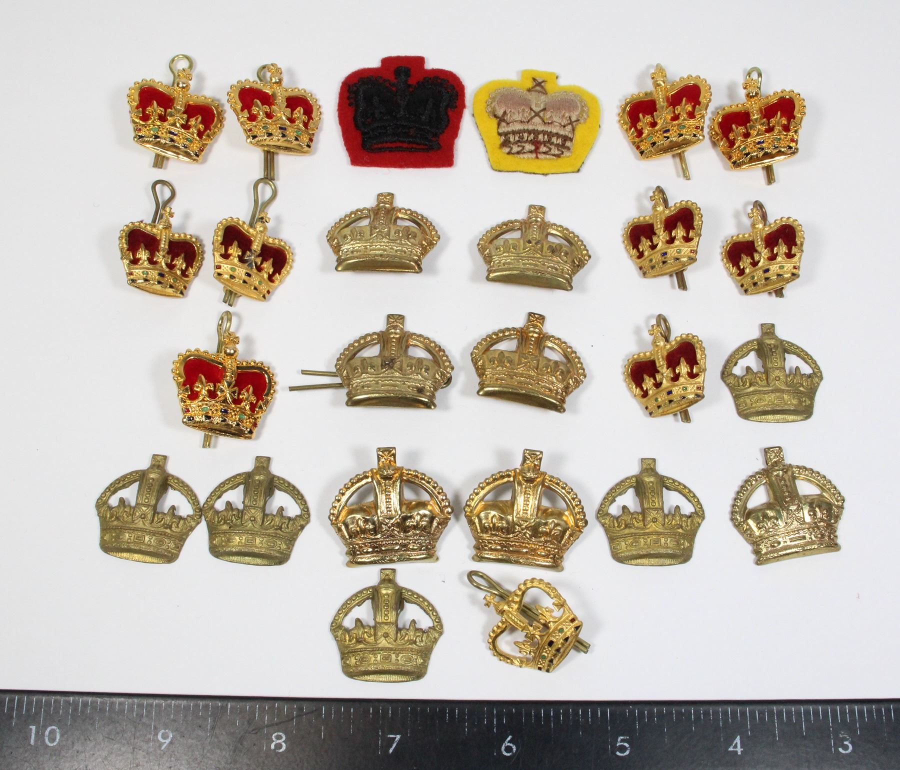 LARGE LOT OF 22 ASSORTED KING GEORGE VI AND QUEEN ELIZABETH II CROWN RANK INSIGNIA FOR MILITARY UNIFORMS, SOME MISSING LUGS ALLIED FORCES
