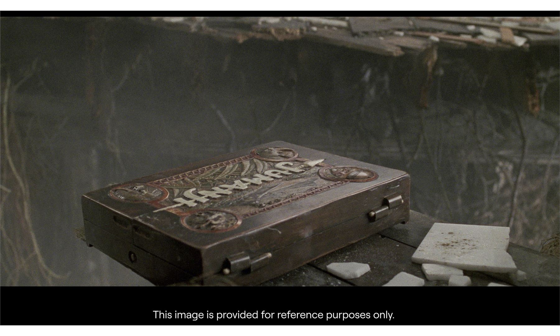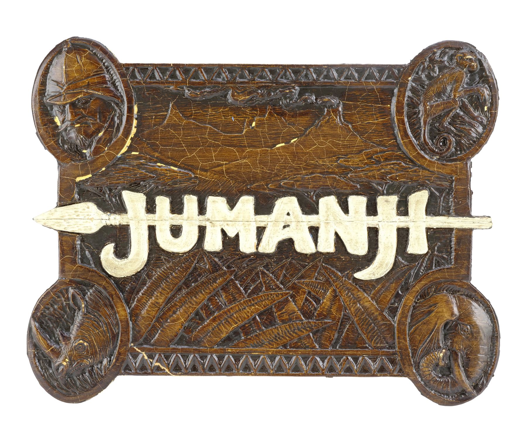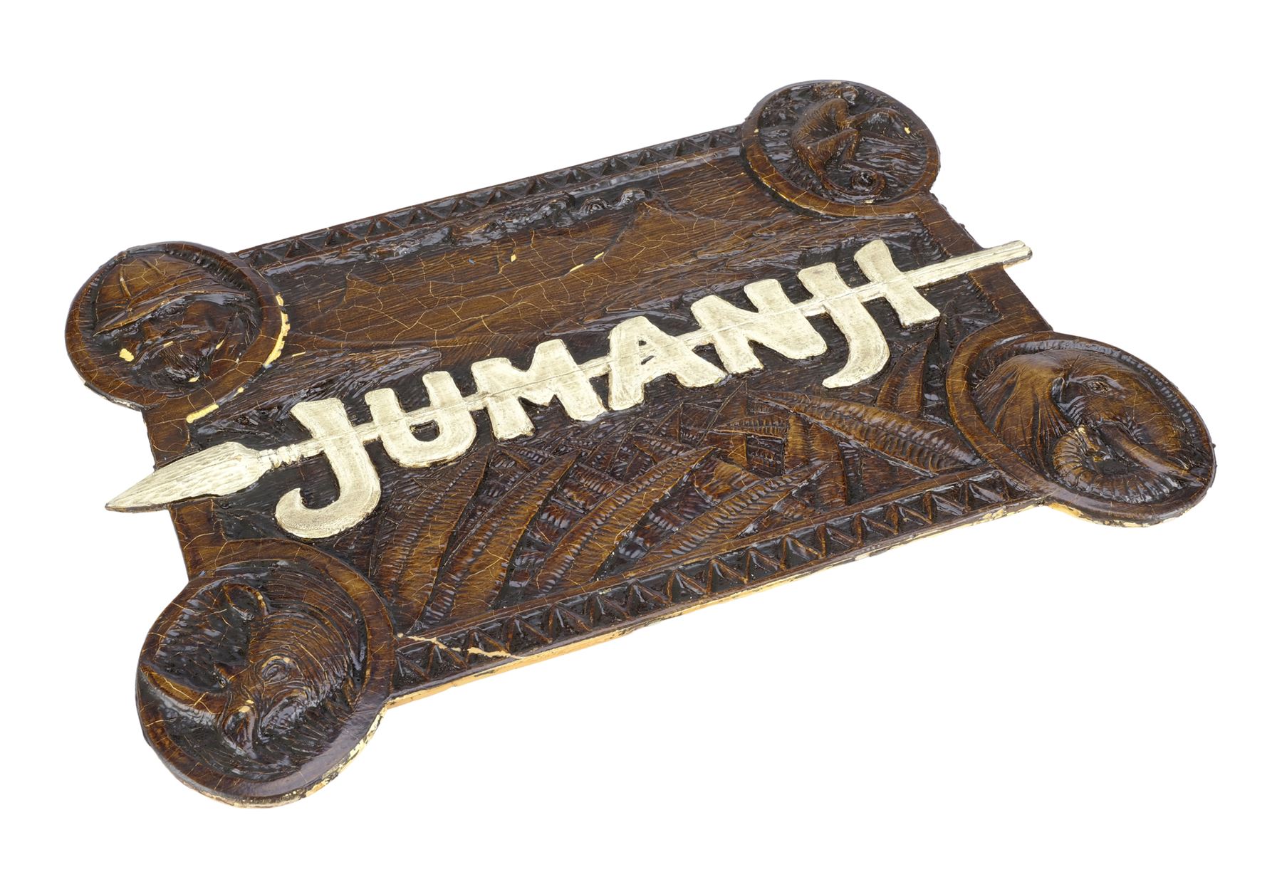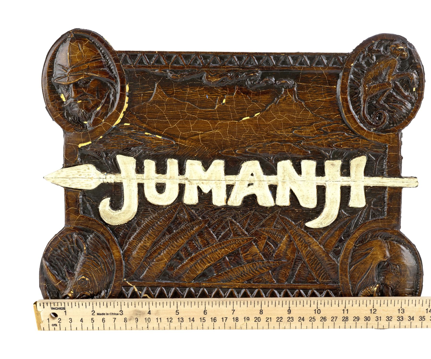 This lot consists of a resin faceplate featuring the word "Jumanji" in front of a scenic background including volcanoes, Acacia trees, shrubbery, and characters from the game and film, including a monkey, a rhinoceros, an elephant, and big game hunter Van Pelt (Jonathan Hyde) on the corners. The piece is hand-painted brown and beige and intentionally distressed by production to appear aged and worn. This lot exhibits chipped paint and tape residue on the backing. Dimensions 14" x 11" x 0.25" (35.75 cm x 28 cm x 0.75 cm)