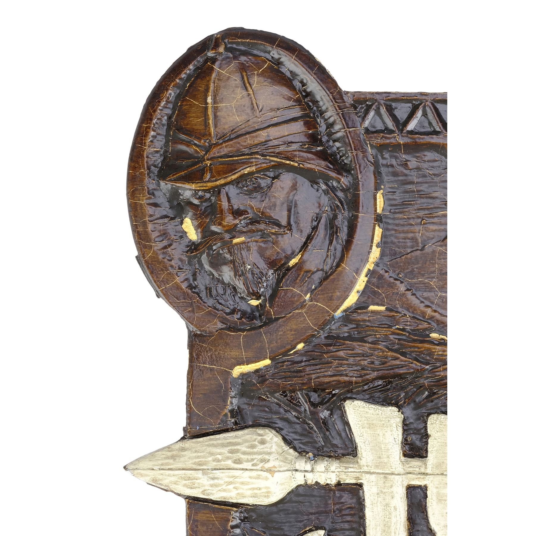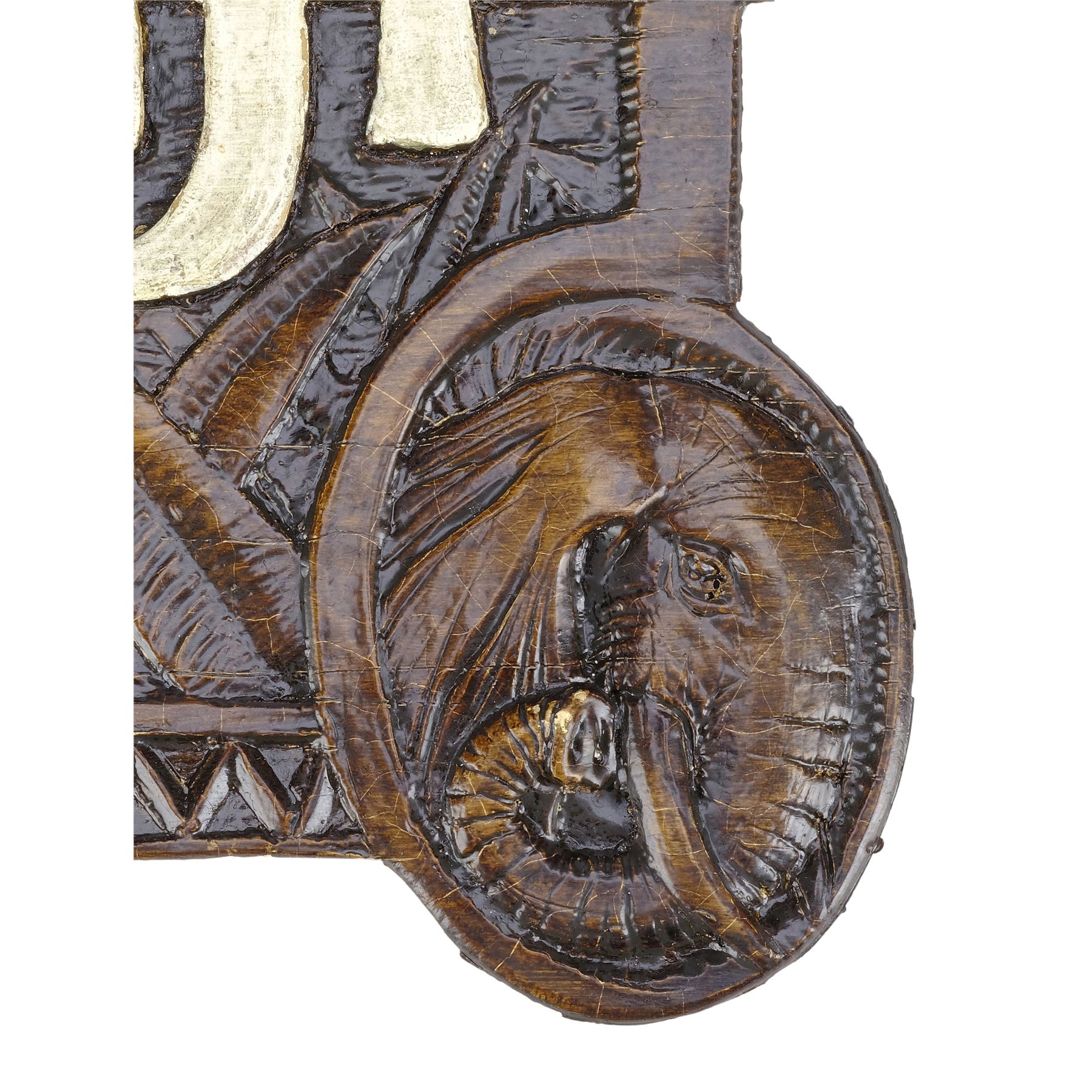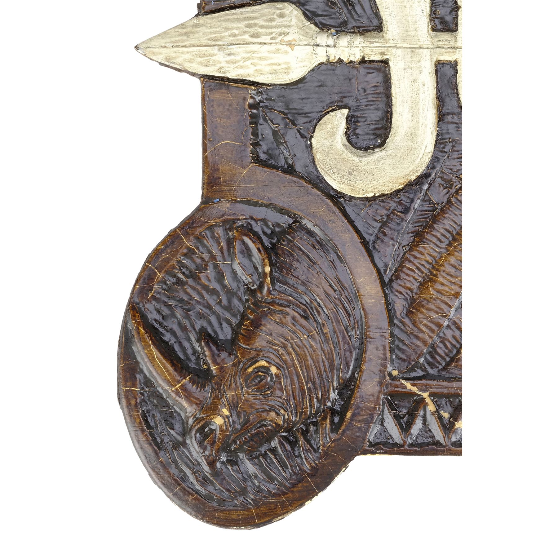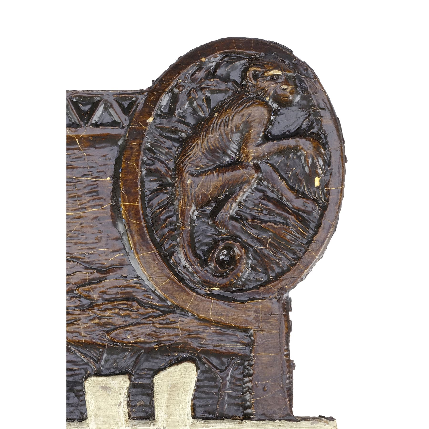 This lot consists of a resin faceplate featuring the word "Jumanji" in front of a scenic background including volcanoes, Acacia trees, shrubbery, and characters from the game and film, including a monkey, a rhinoceros, an elephant, and big game hunter Van Pelt (Jonathan Hyde) on the corners. The piece is hand-painted brown and beige and intentionally distressed by production to appear aged and worn. This lot exhibits chipped paint and tape residue on the backing. Dimensions 14" x 11" x 0.25" (35.75 cm x 28 cm x 0.75 cm)