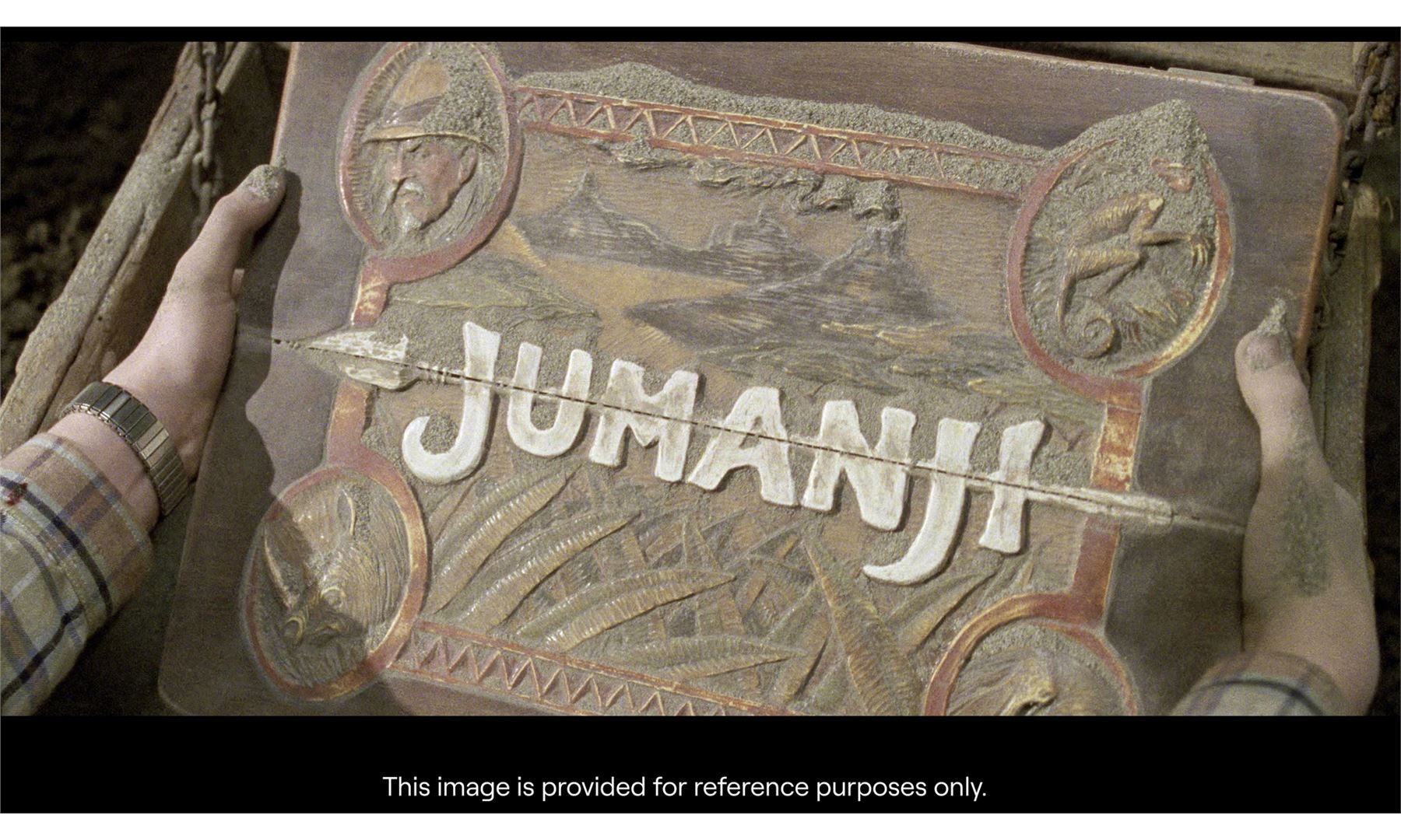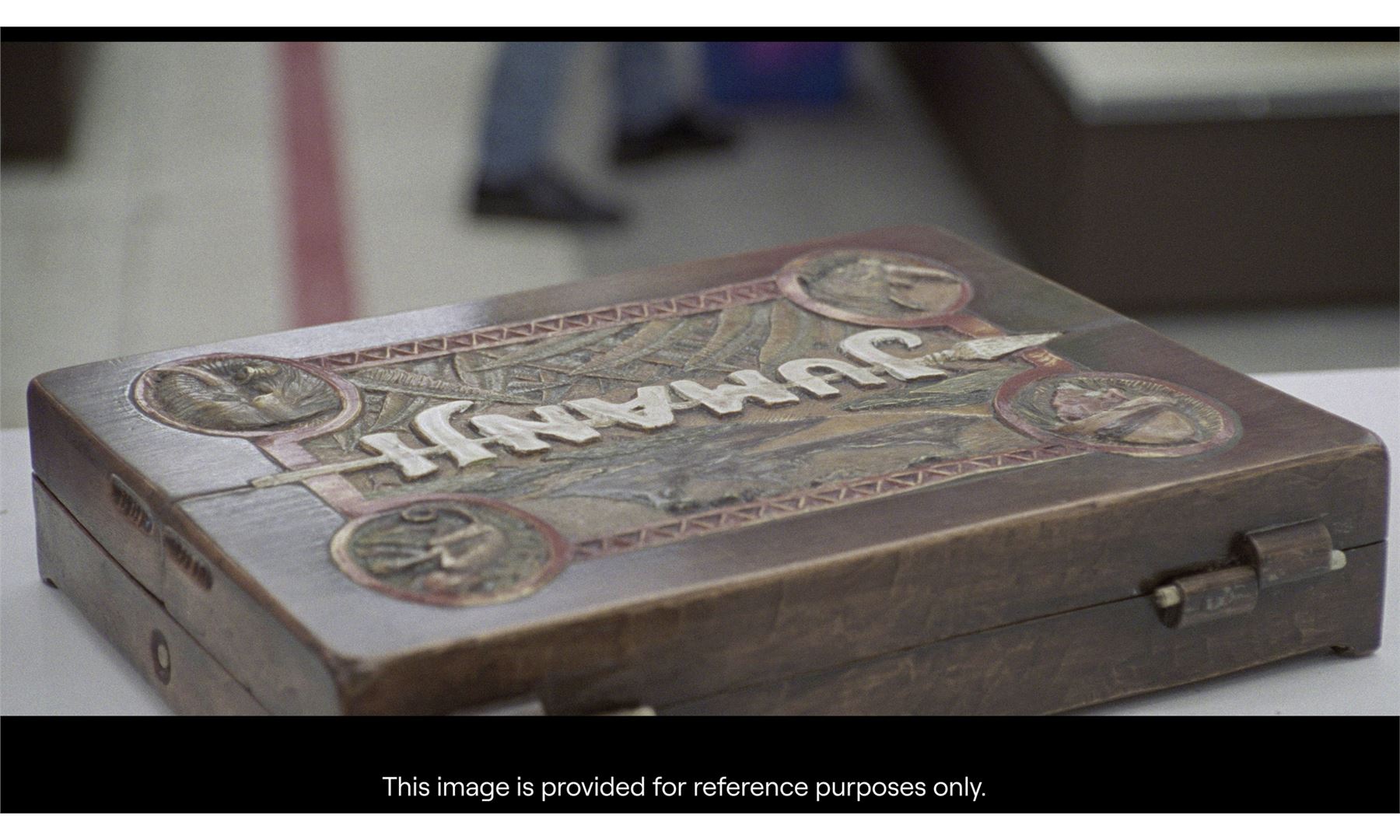 JUMANJI (1995) - Early Paint Test Game Board Cover - A game board cover early paint test from Joe Johnston's family adventure Jumanji. Alan Parrish (Robin Williams), Sarah Whittle (Bonnie Hunt), Judy Shepherd (Kirsten Dunst), and Peter Shepherd (Bradley Pierce) played a mysterious, dangerous magic game called Jumanji that featured a two-piece faceplate.
