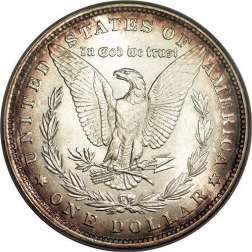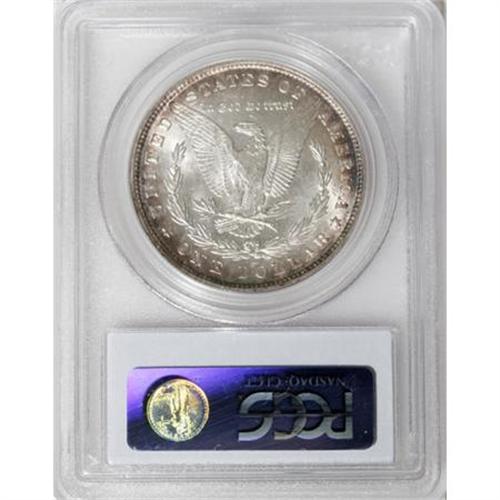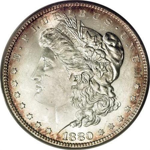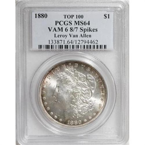 <B>1880 $1 8/7 Overdate MS64 PCGS.</B></I> Ex: Leroy Van Allen. VAM-6, 8/7 Spikes. A Top 100 Variety. The "spikes" are tiny horns from an underlying 7 atop each side of the second 8. Fey and Oxman in 1997 wrote that fewer than 10 BU specimens were known. VAM-6 is listed as unknown above MS62 in the <I>Winter 2007 Top 100 Morgan Dollar Value Guide </B></I>published by Dr. Michael Fey. This lustrous piece has amber-gold rims with much eye appeal and frosty surfaces. A few reeding marks determine the grade.<BR><I>From The Leroy Van Allen Collection.</B></I><BR><BR><b>Shipping:</b> Coins & Currency (<a target="_blank" href="http://www.heritageauctions.com/common/shipping.php">view shipping information</a>)