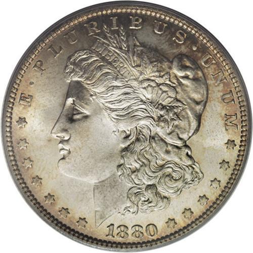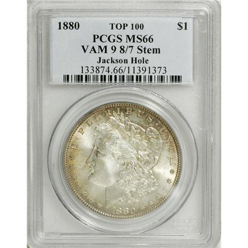 <B>1880 $1 8/7 Overdate MS66 PCGS.</B></I> Ex: Jackson Hole. VAM-9, R.4. A Top 100 Variety. Faint remnants of a 7 are noted in the upper and lower loops of the second 8 in the date. Most of the obverse stars are doubled or tripled toward the rim. This is a visually pleasing Premium Gem that is well struck with intense satiny luster and lovely variegated toning on both sides.<BR><I>From The Jackson Hole Collection.</B></I><BR><BR><b>Shipping:</b> Coins & Currency (<a target="_blank" href="http://www.heritageauctions.com/common/shipping.php">view shipping information</a>)