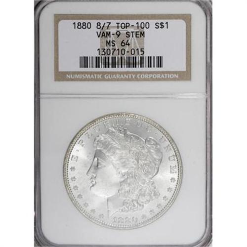 <B>1880 $1 8 Over 7 MS64 NGC.</B></I> VAM-9. A Top 100 Variety. A "Stem" overdate variety. NGC Census: (0/0). PCGS Population (16/3). (#7098)<BR><BR><B>Coin Engraver:</B> George T. Morgan<BR><BR><b>Shipping:</b> Coins & Currency (<a target="_blank" href="http://www.heritageauctions.com/common/shipping.php">view shipping information</a>)