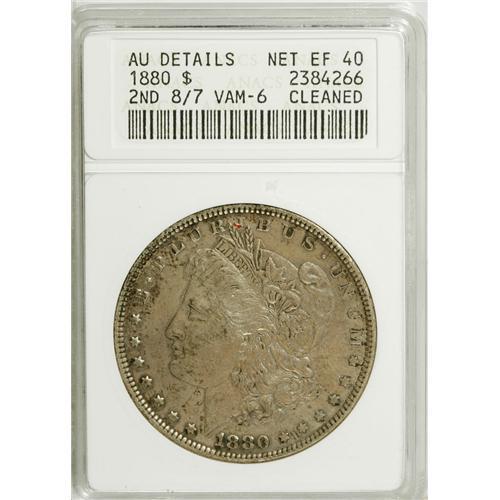 <B>1880 $1 --Cleaned--ANACS. AU Details, Net XF40.</B></I> 2nd 8/7 Vam-6. NGC Census: (4/6692). PCGS Population (6/7721). Mintage: 12,601,355. Numismedia Wsl. Price: $17. (#7096)<BR><BR><b>Shipping:</b> Coins & Currency (<a target="_blank" href="http://www.heritageauctions.com/common/shipping.php">view shipping information</a>)
