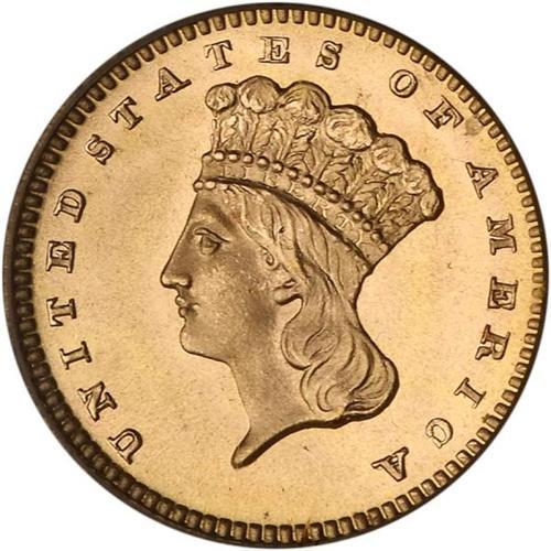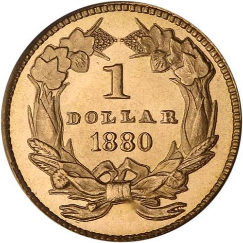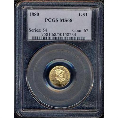 <b>1880 $1 Gold Indian. PCGS graded MS68.</b> NGC Pop: 17/2. Jaw-dropping quality and the grade says it all: Each side has a bright yellow-gold accents that roll and undulate with balancing orange-gold color. Desirable with this precision strike, and a low mintage date just to entice you further. A lowly 1,636 pieces were struck of the 1880 gold dollar, 36 of which comprise the Proofs.