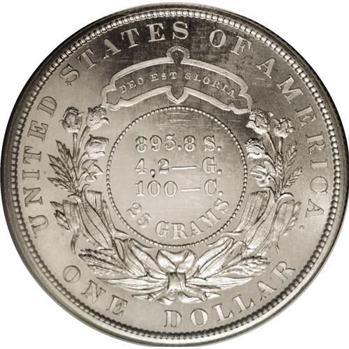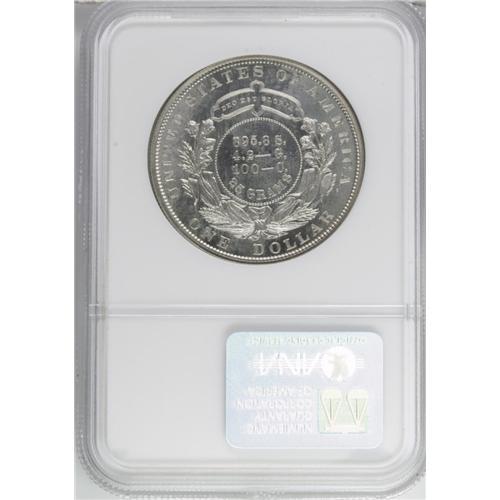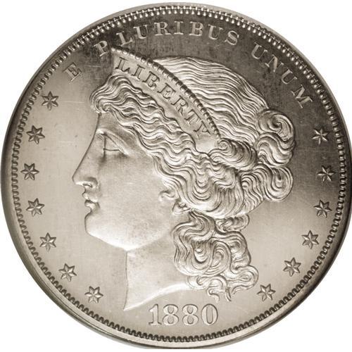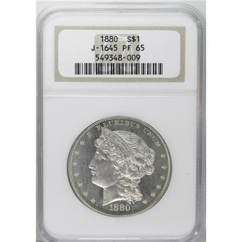 <B>1880 $1 Goloid Metric Dollar, Judd-1645, Pollock-1845, High R.6, PR65 NGC.</B></I> The obverse and reverse designs are the same as Judd-1617 except for the date. Struck in goloid with a reeded edge. This is a gorgeous Gem proof with bright silver surfaces and wispy ivory toning. The devices have a touch of luster and are framed by reflective fields.<BR><I>From The Jones Beach Collection.</B></I><BR><BR><b>Shipping:</b> Coin/Currency (<a target="_blank" href="http://www.heritageauctions.com/common/shipping.php">view shipping information</a>)