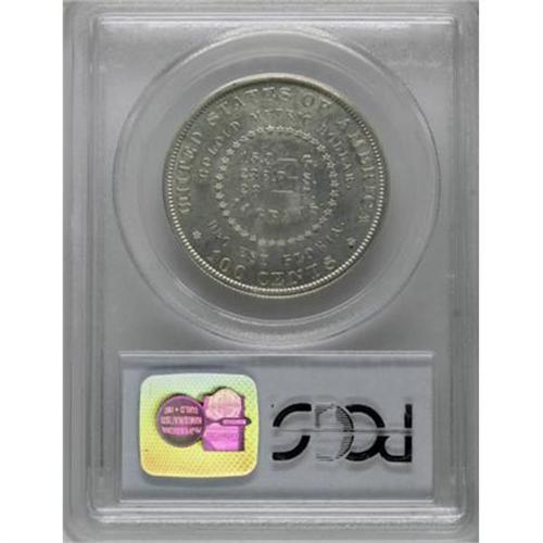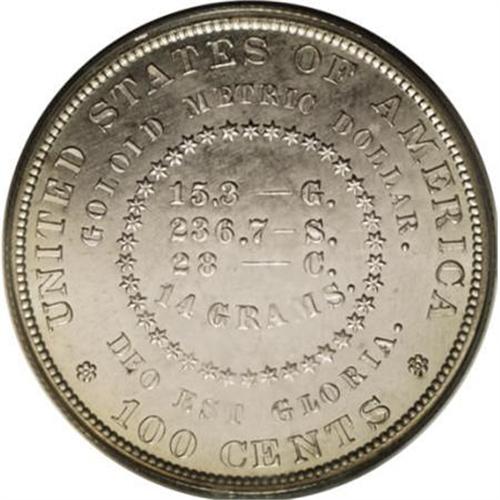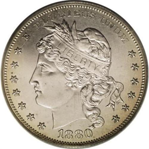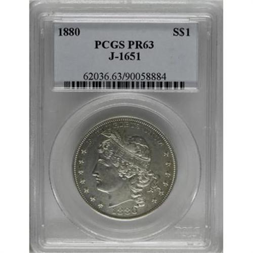 <B>1880 $1 Goloid Metric Dollar, Judd-1651, Pollock-1851, Low R.7, PR63 PCGS.</B></I> On the obverse, a head of Liberty faces left wearing a cap inscribed LIBERTY. The top of the cap is ornamented with ears of wheat, cotton leaves, and bolls. E PLURIBUS UNUM is at the top and the date 1880 is below with 13 peripheral stars arranged between. The central reverse expresses the composition of the denomination within a circle of 38 stars. The upper periphery displays the legend UNITED STATES OF AMERICA and the denomination GOLOID METRIC DOLLAR, while the motto DEO EST GLORIA and 100 CENTS are at the lower border. Struck in goloid alloy (5.46% gold, 84.54% silver, and 10.00% copper) with a reeded edge. However, it is unclear if this coin was actually struck in the goloid alloy or merely struck in coin silver as no coins have actually undergone metallurgical analysis. The G in GLORIA is boldly repunched. Hazy blue toning over lightly mirrored silver surfaces. This variety is typically found in lower numerical grades from 60 to 63. The surfaces are lightly hairlined, which is almost always the case.<BR><BR><b>Shipping:</b> Coins & Currency (<a target="_blank" href="http://www.heritageauctions.com/common/shipping.php">view shipping information</a>)