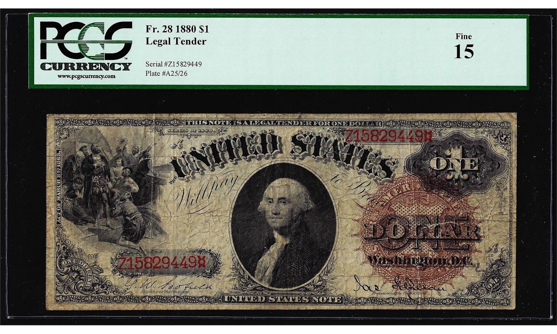 One 1880 $1 Legal Tender Note Fr.28 PCGS Fine 15. PCGS Graded.