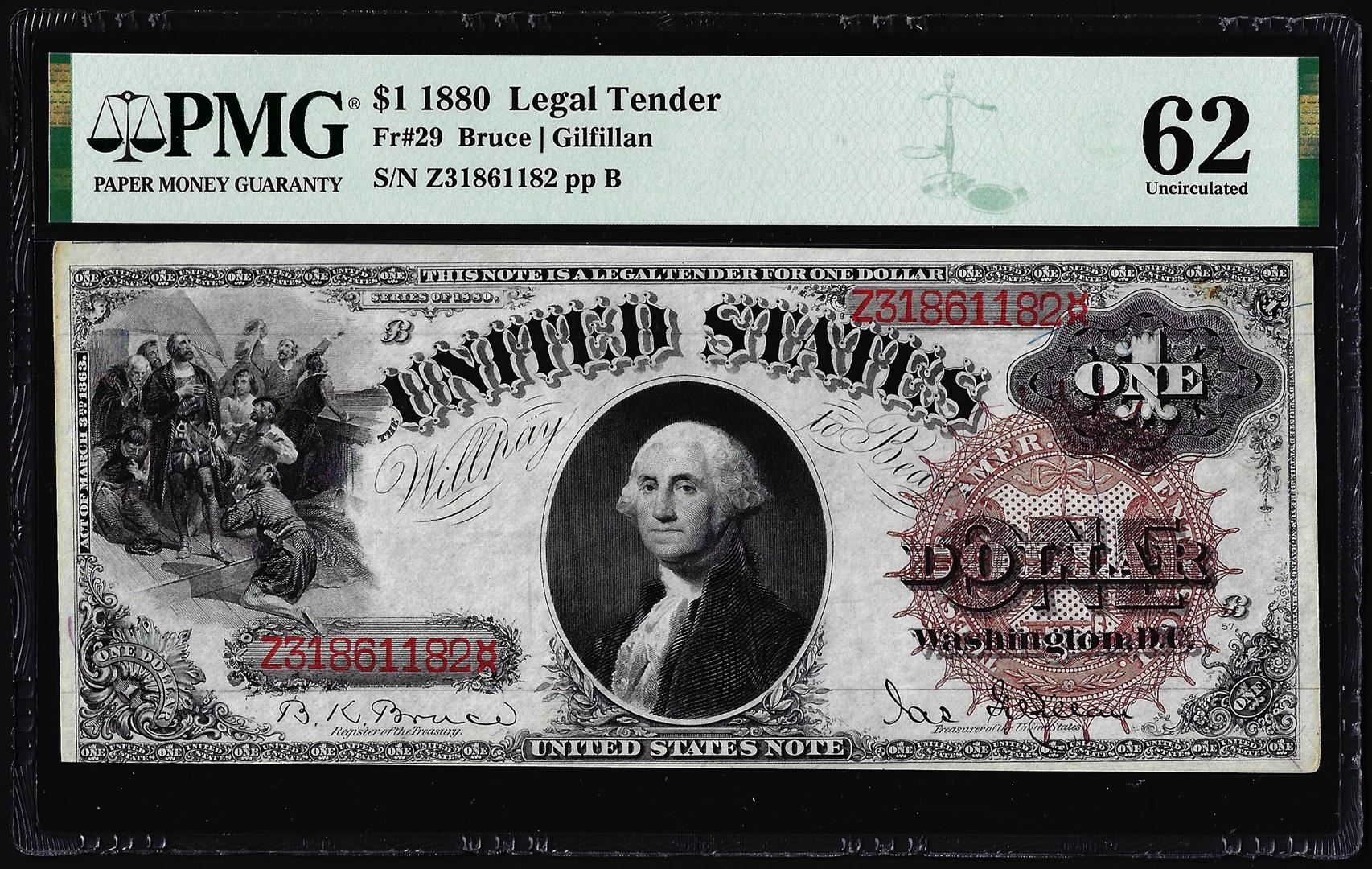 One 1880 $1 Legal Tender Note Fr.29 PMG Uncirculated 62. PMG Certified.