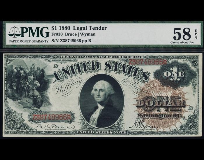 One 1880 $1 Legal Tender Note PMG 58EPQ.