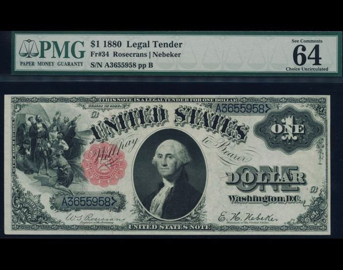 One 1880 $1 Legal Tender Note PMG 64EPQ.