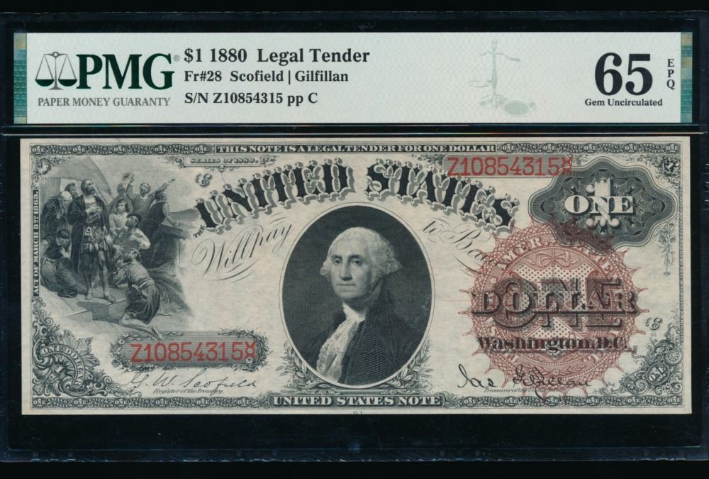 One 1880 $1 Legal Tender Note PMG 65EPQ.