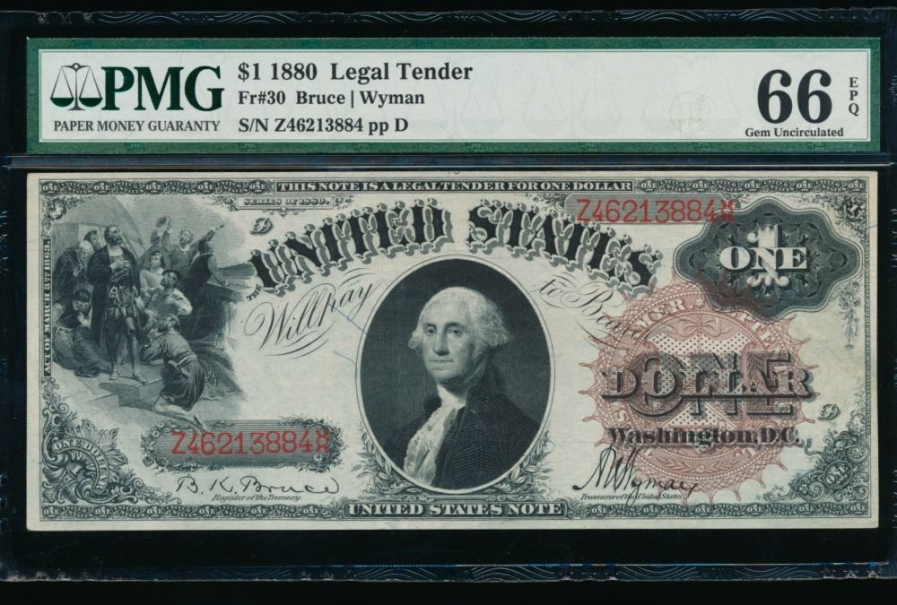 One 1880 $1 Legal Tender Note PMG 66EPQ.
