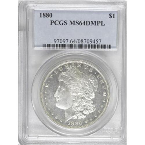 <B>1880 $1 MS64 Deep Mirror Prooflike PCGS.</B></I> The 1880 Morgan dollar, from a mintage of 12.6 million pieces, is readily available today, despite the millions that were melted. Deep Mirror Prooflike specimens, such as the near-Gem in this lot, offer a greater challenge. Sharply struck design elements are highlighted against the deeply mirrored fields. Both sides are essentially untoned, with a scattering of light grade-defining marks. Population: 72 in 64 Deep Mirror Prooflike, 29 finer (9/07).<BR><BR><b>Shipping:</b> Coins & Currency (<a target="_blank" href="http://www.heritageauctions.com/common/shipping.php">view shipping information</a>)