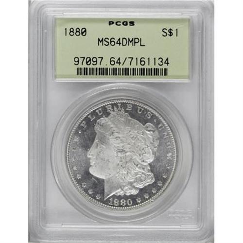 <B>1880 $1 MS64 Deep Mirror Prooflike PCGS.</B></I> A well struck near-Gem with flashy fields and a hint of cameo contrast. Close to brilliant, although wisps of gold are present. Certified in an old green label holder. Population: 74 in 64 DMPL, 29 finer (3/08).<BR><BR><b>Shipping:</b> Coins & Currency (<a target="_blank" href="http://www.heritageauctions.com/common/shipping.php">view shipping information</a>)