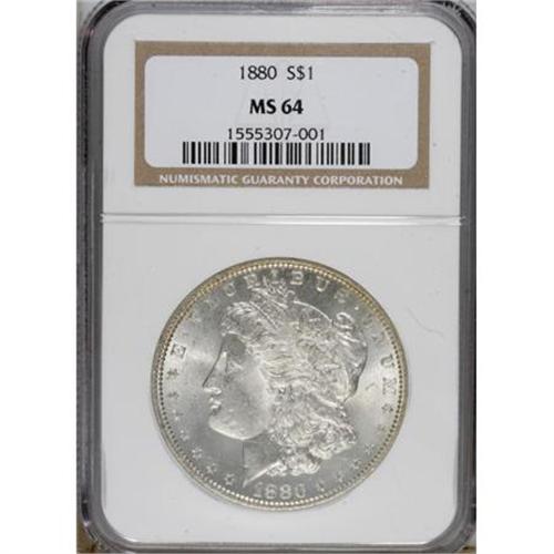<B>1880 $1 MS64 NGC.</B></I> NGC Census: (3262/591). PCGS Population (2833/808). Mintage: 12,601,355. Numismedia Wsl. Price for NGC/PCGS coin in MS64: $108. (#7096)<BR><BR><b>Shipping:</b> Coins & Currency (<a target="_blank" href="http://www.heritageauctions.com/common/shipping.php">view shipping information</a>)