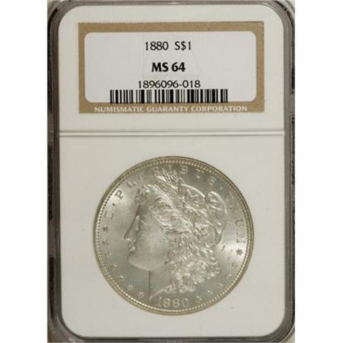 <B>1880 $1 MS64 NGC.</B></I> NGC Census: (3288/594). PCGS Population (2866/857). Mintage: 12,601,355. Numismedia Wsl. Price for NGC/PCGS coin in MS64: $108. (#7096)<BR><BR><B>Coin Engraver:</B> George T. Morgan<BR><BR><b>Shipping:</b> Coins & Currency (<a target="_blank" href="http://www.heritageauctions.com/common/shipping.php">view shipping information</a>\)