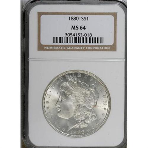 <B>1880 $1 MS64 NGC.</B></I> NGC Census: (3312/591). PCGS Population (2921/917). Mintage: 12,601,355. Numismedia Wsl. Price for NGC/PCGS coin in MS64: $108. (#7096)<BR><BR><B>Coin Engraver:</B> George T. Morgan<BR><BR><b>Shipping:</b> Coins & Currency (<a target="_blank" href="http://www.heritageauctions.com/common/shipping.php">view shipping information</a>)