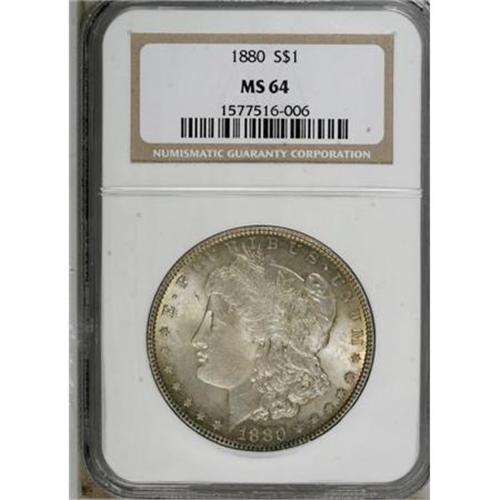 <B>1880 $1 MS64 NGC.</B></I> NGC Census: (3395/595). PCGS Population (2938/907). Mintage: 12,601,355. Numismedia Wsl. Price for NGC/PCGS coin in MS64: $108. (#7096)<BR><BR><B>Coin Engraver:</B> George T. Morgan<BR><BR><b>Shipping:</b> Coins & Currency (<a target="_blank" href="http://www.heritageauctions.com/common/shipping.php">view shipping information</a>)