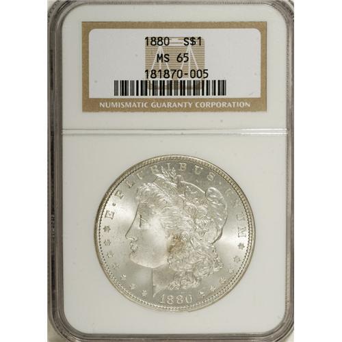 <B>1880 $1 MS65 NGC.</B></I> NGC Census: (545/34). PCGS Population (734/75). Mintage: 12,601,355. Numismedia Wsl. Price for NGC/PCGS coin in MS65: $625. (#7096)<BR><BR><b>Shipping:</b> Coins & Currency (<a target="_blank" href="http://www.heritageauctions.com/common/shipping.php">view shipping information</a>)