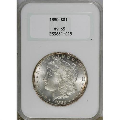 <B>1880 $1 MS65 NGC.</B></I> Boldly impressed for this Philadelphia issue with strong, slightly frosty luster. Minimally toned in the centers, though hints of orange and russet visit the rims. NGC has graded 35 finer pieces (1/08).<BR><BR><B>Coin Engraver:</B> George T. Morgan<BR><BR><b>Shipping:</b> Coins & Currency (<a target="_blank" href="http://www.heritageauctions.com/common/shipping.php">view shipping information</a>)