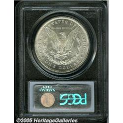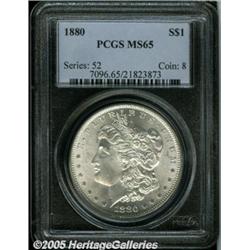 <B>1880<img border='0' src='http://www.heritagecoins.com/images/star.gif' width=10 height=10>$1 MS65 PCGS.</B></I> Swirling luster over bright untoned surfaces. Crisply struck features and very few small contact marks on either side of this visually pleasing Gem.