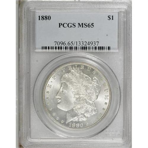 <B>1880 $1 MS65 PCGS.</B></I> Well-defined overall, though the hair above the ear shows slight softness as usual. The strongly lustrous fields show just a touch of haze over each side.<BR><BR><B>Coin Engraver:</B> George T. Morgan<BR><BR><b>Shipping:</b> Coins & Currency (<a target="_blank" href="http://www.heritageauctions.com/common/shipping.php">view shipping information</a>)
