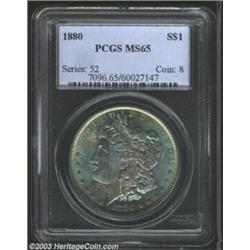 <TR><TD width="100%"><TABLE cellSpacing=1 cellPadding=3 width="100%" border=0><TBODY><TR><TD width="100%" bgColor=#79735c><FONT face=arial color=#ffffff size=3><B>Description</B> </FONT></TD></TR><TR><TD width="100%" bgColor=#ffffff><FONT face=arial size=2><B>1880 $1 MS65 PCGS.</B></I> Bright emerald-green, yellow, and violet colors blanket the obverse, while the reverse only displays vague hints of light toning. There are several pinscratches and moderate abrasions on the obverse, but the reverse only has a few small ticks, and a wispy reeding mark below the motto. </FONT></TD></TR></TBODY></TABLE></TD></TR></TBODY></TABLE><BR><A name=PricesRealized></A><TABLE cellSpacing=0 cellPadding=0 width="100%" bgColor=#000000 border=0><TBODY><TR><TD width="100%"><TABLE cellSpacing=1 cellPadding=3 width="100%" border=0><TBODY><TR><TD width="100%" bgColor=#79735c><A name=PR><FONT face=arial color=#ffffff size=3><B>Previous Prices from Heritage Auctions</B> </FONT></A></TD></TR><TR><TD bgColor=#f6f6ed><TABLE cellSpacing=0 cellPadding=0 width="100%" border=1><TBODY><TR><TD align=middle width="33%"><B>Date</B></TD><TD align=middle width="33%"><B>Service</B></TD><TD align=middle width="33%"><B>Price</B></TD></TR><TR bgColor=whitesmoke><TD width="33%"><B>03/25/2003</B></TD><TD width="33%">PCGS</TD><TD width="33%">$517.50</TD></TR><TR bgColor=whitesmoke><TD width="33%"><B>03/25/2003</B></TD><TD width="33%">PCGS</TD><TD width="33%">$517.50</TD></TR><TR bgColor=whitesmoke><TD width="33%"><B>02/01/2000</B></TD><TD width="33%">PCGS</TD><TD width="33%">$719.00</TD></TR><TR bgColor=whitesmoke><TD width="33%"><B>11/01/1999</B></TD><TD width="33%">PCGS</TD><TD width="33%">$440.00</TD></TR><TR bgColor=whitesmoke><TD width="33%"><B>11/01/1999</B></TD><TD width="33%">PCGS</TD><TD width="33%">$440.00</TD></TR><TR bgColor=whitesmoke><TD width="33%"><B>06/01/1998</B></TD><TD width="33%">PCGS</TD><TD width="33%">$638.00</TD></TR><TR bgColor=whitesmoke><TD width="33%"><B>10/01/1998</B></TD><TD width="33%">PCGS</TD><TD width="33%">$550.00</TD></TR><TR bgColor=whitesmoke><TD width="33%"><B>10/01/1998</B></TD><TD width="33%">PCGS</TD><TD width="33%">$550.00</TD></TR><TR bgColor=whitesmoke><TD width="33%"><B>11/01/1999</B></TD><TD width="33%">PCGS</TD><TD width="33%">$604.00</TD></TR><TR bgColor=whitesmoke><TD width="33%"><B>11/01/1999</B></TD><TD width="33%">PCGS</TD><TD width="33%">$604.00</TD></TR><TR bgColor=whitesmoke><TD width="33%"><B>11/01/1999</B></TD><TD width="33%">PCGS</TD><TD width="33%">$604.00</TD></TR><TR bgColor=whitesmoke><TD width="33%"><B>03/01/1998</B></TD><TD width="33%">PCGS</TD><TD width="33%">$550.00</TD></TR><TR bgColor=whitesmoke><TD width="33%"><B>03/01/1998</B></TD><TD width="33%">PCGS</TD><TD width="33%">$522.00</TD></TR><TR bgColor=whitesmoke><TD width="33%"><B>03/01/1998</B></TD><TD width="33%">PCGS</TD><TD width="33%">$522.00</TD></TR><TR bgColor=whitesmoke><TD width="33%"><B>03/01/1998</B></TD><TD width="33%">PCGS</TD><TD width="33%">$577.00</TD></TR><TR bgColor=whitesmoke><TD width="33%"><B>04/17/2001</B></TD><TD width="33%">PCGS</TD><TD width="33%">$575.00</TD></TR><TR bgColor=whitesmoke><TD width="33%"><B>04/17/2001</B></TD><TD width="33%">PCGS</TD><TD width="33%">$575.00</TD></TR><TR bgColor=whitesmoke><TD width="33%"><B>01/07/2000</B></TD><TD width="33%">PCGS</TD><TD width="33%">$632.50</TD></TR><TR bgColor=whitesmoke><TD width="33%"><B>05/31/2001</B></TD><TD width="33%">PCGS</TD><TD width="33%">$632.50</TD></TR><TR bgColor=whitesmoke><TD width="33%"><B>05/31/2001</B></TD><TD width="33%">PCGS</TD><TD width="33%">$632.50</TD></TR><TR bgColor=whitesmoke><TD width="33%"><B>01/11/2003</B></TD><TD width="33%">PCGS</TD><TD width="33%">$805.00</TD></TR><TR bgColor=whitesmoke><TD width="33%"><B>12/14/2002</B></TD><TD width="33%">PCGS</TD><TD width="33%">$552.00</TD></TR><TR bgColor=whitesmoke><TD width="33%"><B>12/14/2002</B></TD><TD width="33%">PCGS</TD><TD width="33%">$552.00</TD></TR><TR bgColor=whitesmoke><TD width="33%"><B>11/25/2002</B></TD><TD width="33%">PCGS</TD><TD width="33%">$474.95</TD></TR><TR bgColor=whitesmoke><TD width="33%"><B>11/12/2002</B></TD><TD width="33%">PCGS</TD><TD width="33%">$661.25</TD></TR><TR bgColor=whitesmoke><TD width="33%"><B>11/12/2002</B></TD><TD width="33%">PCGS</TD><TD width="33%">$661.25</TD></TR><TR bgColor=whitesmoke><TD width="33%"><B>09/28/2002</B></TD><TD width="33%">PCGS</TD><TD width="33%">$506.00</TD></TR><TR bgColor=whitesmoke><TD width="33%"><B>06/22/2000</B></TD><TD width="33%">PCGS</TD><TD width="33%">$644.00</TD></TR><TR bgColor=whitesmoke><TD width="33%"><B>06/22/2000</B></TD><TD width="33%">PCGS</TD><TD width="33%">$644.00</TD></TR><TR bgColor=whitesmoke><TD width="33%"><B>01/01/2001</B></TD><TD width="33%">PCGS</TD><TD width="33%">$518.00</TD></TR><TR bgColor=whitesmoke><TD width="33%"><B>01/09/2002</B></TD><TD width="33%">PCGS</TD><TD width="33%">$2,070.00</TD></TR><TR bgColor=whitesmoke><TD width="33%"><B>01/09/2002</B></TD><TD width="33%">PCGS</TD><TD width="33%">$2,070.00</TD></TR><TR bgColor=whitesmoke><TD width="33%"><B>07/29/2002</B></TD><TD width="33%">PCGS</TD><TD width="33%">$529.00</TD></TR><TR bgColor=whitesmoke><TD width="33%"><B>07/30/2002</B></TD><TD width="33%">PCGS</TD><TD width="33%">$603.75</TD></TR><TR bgColor=whitesmoke><TD width="33%"><B>07/30/2002</B></TD><TD width="33%">PCGS</TD><TD width="33%">$603.75</TD></TR><TR bgColor=whitesmoke><TD width="33%"><B>07/09/2002</B></TD><TD width="33%">PCGS</TD><TD width="33%">$575.00</TD></TR><TR bgColor=whitesmoke><TD width="33%"><B>06/08/2002</B></TD><TD width="33%">PCGS</TD><TD width="33%">$529.00</TD></TR><TR bgColor=whitesmoke><TD width="33%"><B>06/08/2002</B></TD><TD width="33%">PCGS</TD><TD width="33%">$529.00</TD></TR><TR bgColor=whitesmoke><TD width="33%"><B>04/28/2002</B></TD><TD width="33%">PCGS</TD><TD width="33%">$552.00</TD></TR><TR bgColor=whitesmoke><TD width="33%"><B>04/27/2002</B></TD><TD width="33%">PCGS</TD><TD width="33%">$1,495.00</TD></TR><TR bgColor=white