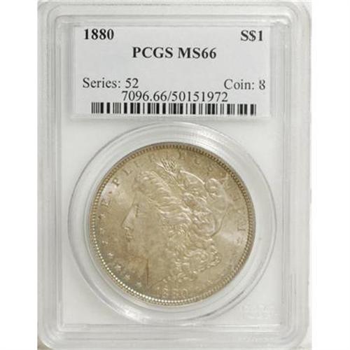 <B>1880 $1 MS66 PCGS.</B></I> Mint State examples of the 1880 Morgan dollar are plentiful in the lower and middle ranges. Most examples are MS63 and MS64, where PCGS and NGC combined have certified more than 10,000 specimens. Gems are somewhat scarcer, and Premium Gems account for fewer than 100 coins. A scant two MS67 examples are known. This piece displays fully lustrous surfaces bathed in orange-lilac toning in the center areas, accenting iridescent cobalt-blue at the peripheries. The design elements are adequately impressed, and the surfaces are relatively clean. A few minute marks on Liberty's cheek and in the left (facing) obverse field are mentioned for accuracy. Population: 76 in 66, 0 finer (7/07).<BR><BR><B>Coin Engraver:</B> George T. Morgan<BR><BR><b>Shipping:</b> Coins & Currency (<a target="_blank" href="http://www.heritageauctions.com/common/shipping.php">view shipping information</a>\)