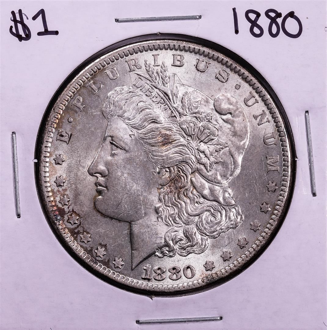 One 1880 $1 Morgan Silver Dollar Coin.