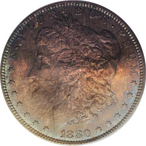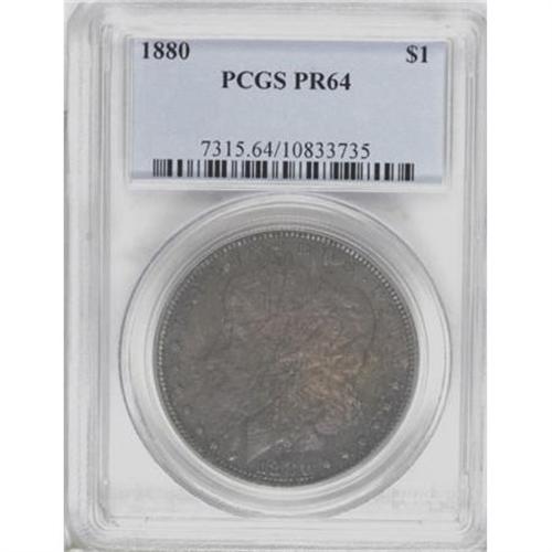 <B>1880 $1 PR64 PCGS.</B></I> Deeply patinated in russet-brown, mauve-red, and electric-blue. A pair of thin, faded grazes near the M in UNUM determine the grade. The presence of the proof-only Trade dollar led to greater sales of 1880 proof sets, although proof 1880 remain very scarce, especially in comparison with the common business strikes.<BR><BR><B>Coin Engraver:</B> George T. Morgan<BR><BR><b>Shipping:</b> Coins & Currency (<a target="_blank" href="http://www.heritageauctions.com/common/shipping.php">view shipping information</a>)