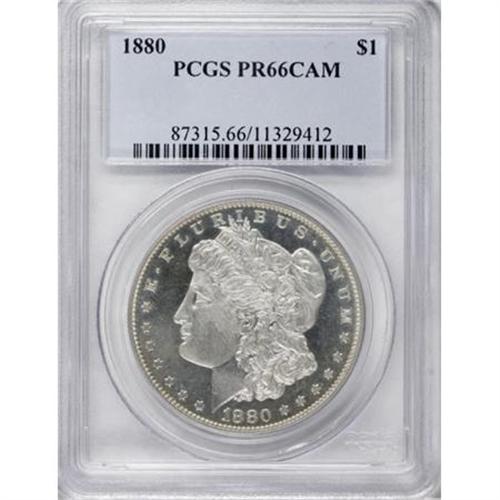 <B>1880 $1 PR66 Cameo PCGS.</B></I> This fully struck Premium Gem features traces of gold patina, and lacks any indication of post-striking contact. A subtle, narrow vertical toning streak ventures from the second L in DOLLAR to the W in WE. On the reverse, IN GOD WE TRUST is lightly die doubled. Population: 14 in 66, 9 finer (12/07).<BR><BR><b>Shipping:</b> Coins & Currency (<a target="_blank" href="http://www.heritageauctions.com/common/shipping.php">view shipping information</a>)