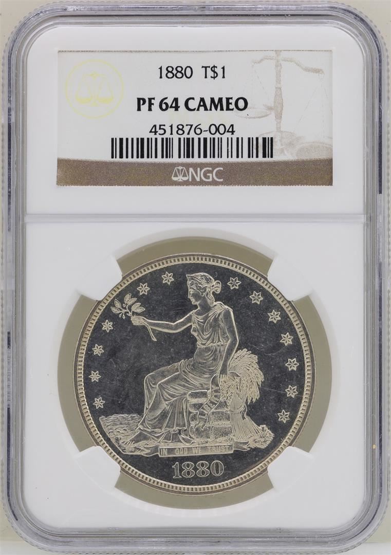 One 1880 $1 Trade Silver Dollar Proof Coin NGC PF64 Cameo. NGC Certified.