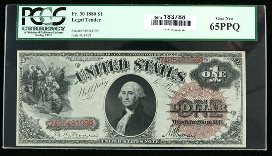 1880, $1 United States Note. PCGS Gem New 65PPQ. . Fr-30. Excellent margins, bold originality, and wonderful contrast between the design colors and the cream-colored paper give this Gem fantastic aesthetic appeal.