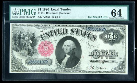 1880, $1 United States Note. . Fr-34. PMG graded Choice Uncirculated 64. Cut Sheet 2 of 4. A/N A3656182 pp B. Small Red Seal.