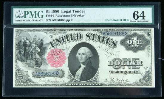 1880, $1 United States Note. . Fr-34. PMG graded Choice Uncirculated 64. Cut Sheet 3 of 4. S/N A 3656183 pp C. Small Red Seal.