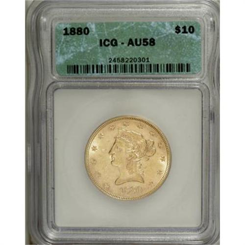 <B>1880 $10 AU58 ICG.</B></I> NGC Census: (132/1110). PCGS Population (119/554). Mintage: 1,644,876. Numismedia Wsl. Price for NGC/PCGS coin in AU58: $400. (#8687)<BR><BR><B>Coin Engraver:</B> Christian Gobrecht<BR><BR><b>Shipping:</b> Coins & Currency (<a target="_blank" href="http://www.heritageauctions.com/common/shipping.php">view shipping information</a>\)